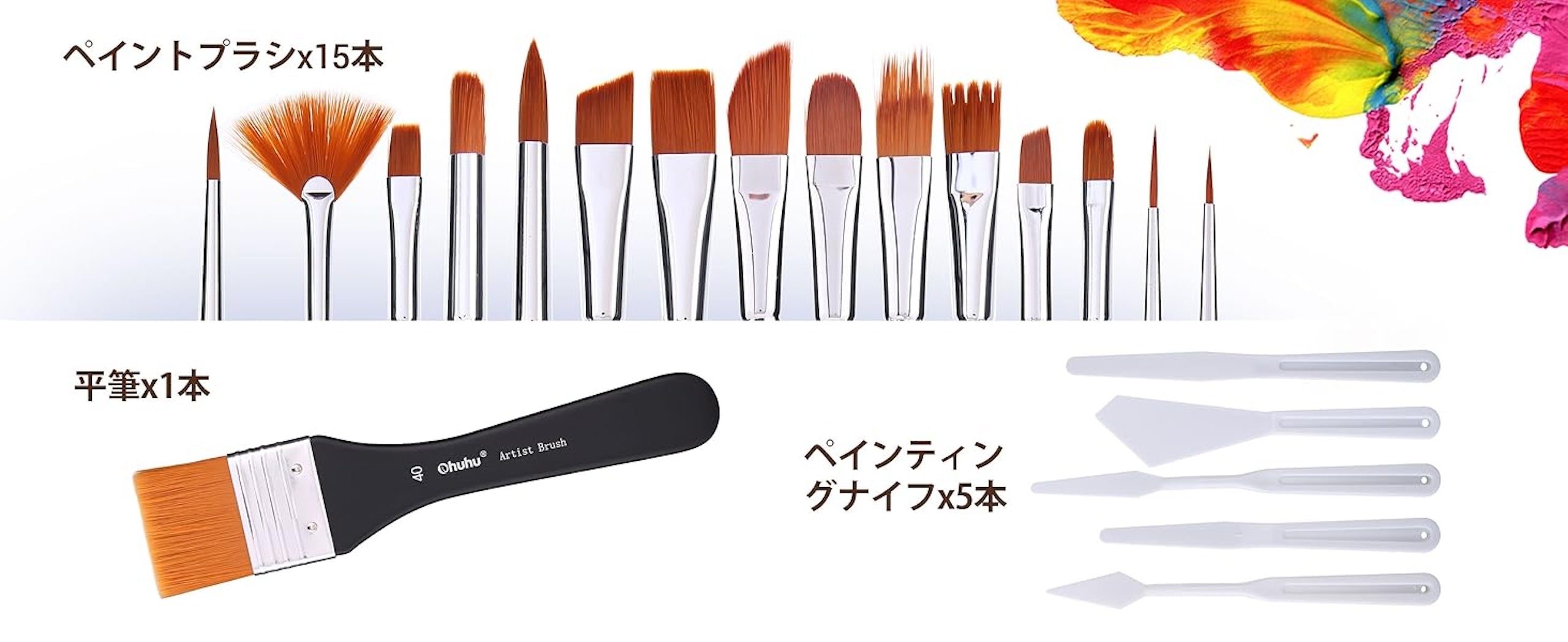 弾力が強く、上質なナイロンで作られており、変形しにくいです。初心者も専門家も大変使いやすい筆です。丸筆、フィルバート型とフラット型があり、様々なニーズに対応可能。ペインティングナイフも5本付、筆とは異なる力強く硬質な表現ができます。ご注意:使用後、筆は洗い終わったら、十分乾燥させてから保存してください。