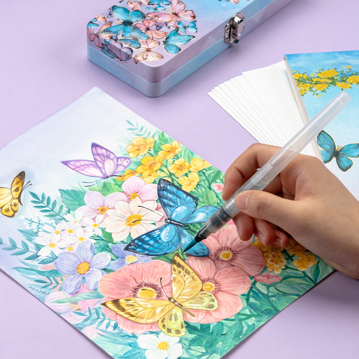 水彩紙やアクリルファインライナーペン、水筆ペン、スポンジ、パレット等スケッチの必要な画材が付き、豊富なセットになりました。また、専用の収納ケースも付きます。コンパクトでカバンに収納でき、外出や旅行先への持ち運びにも便利です。いつでも気軽に絵を描くことができます。