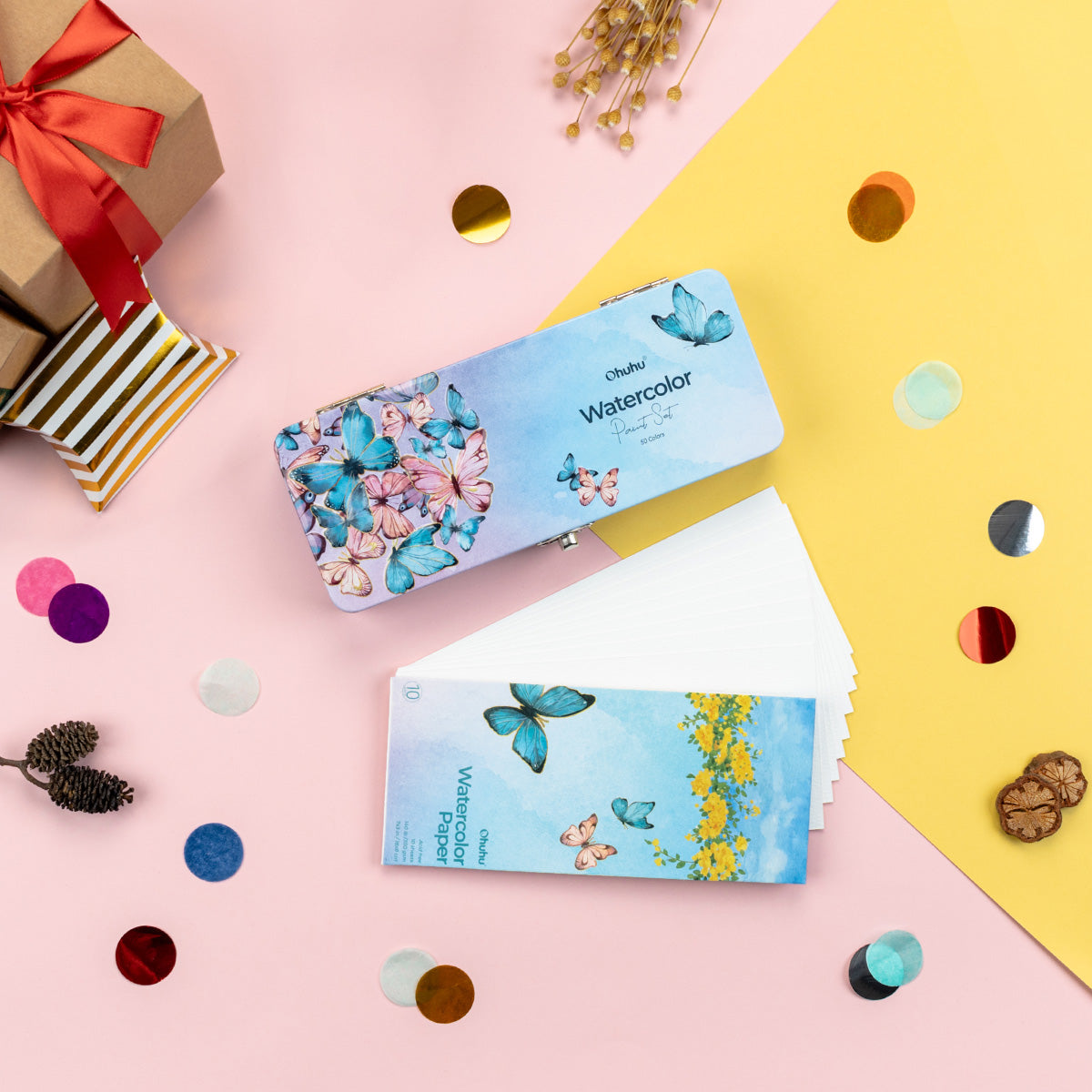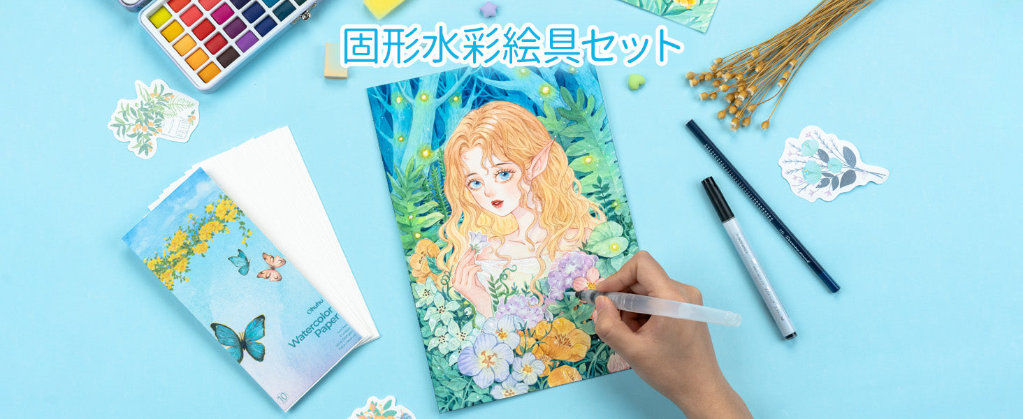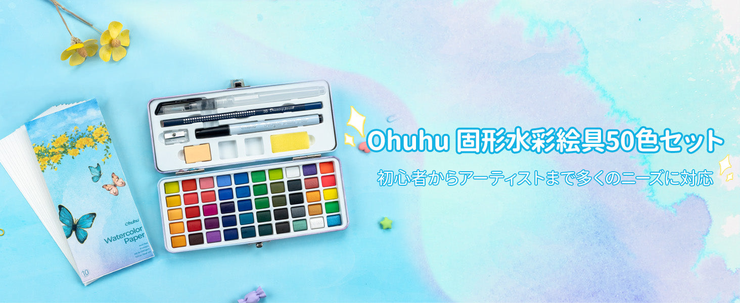 Ohuhuの固形水彩は、38色の基本色をベースに4色の蛍光カラーや8色のメタリックカラーが揃っています。38色の基本色は、日常の塗り絵やスケッチすることなどに最適。蛍光カラーは、華やかな質感を加えることができます。メタリックカラーはハイライト用として使うことができます。50色の組み合わせなので、多くの創造ニーズに応えます。