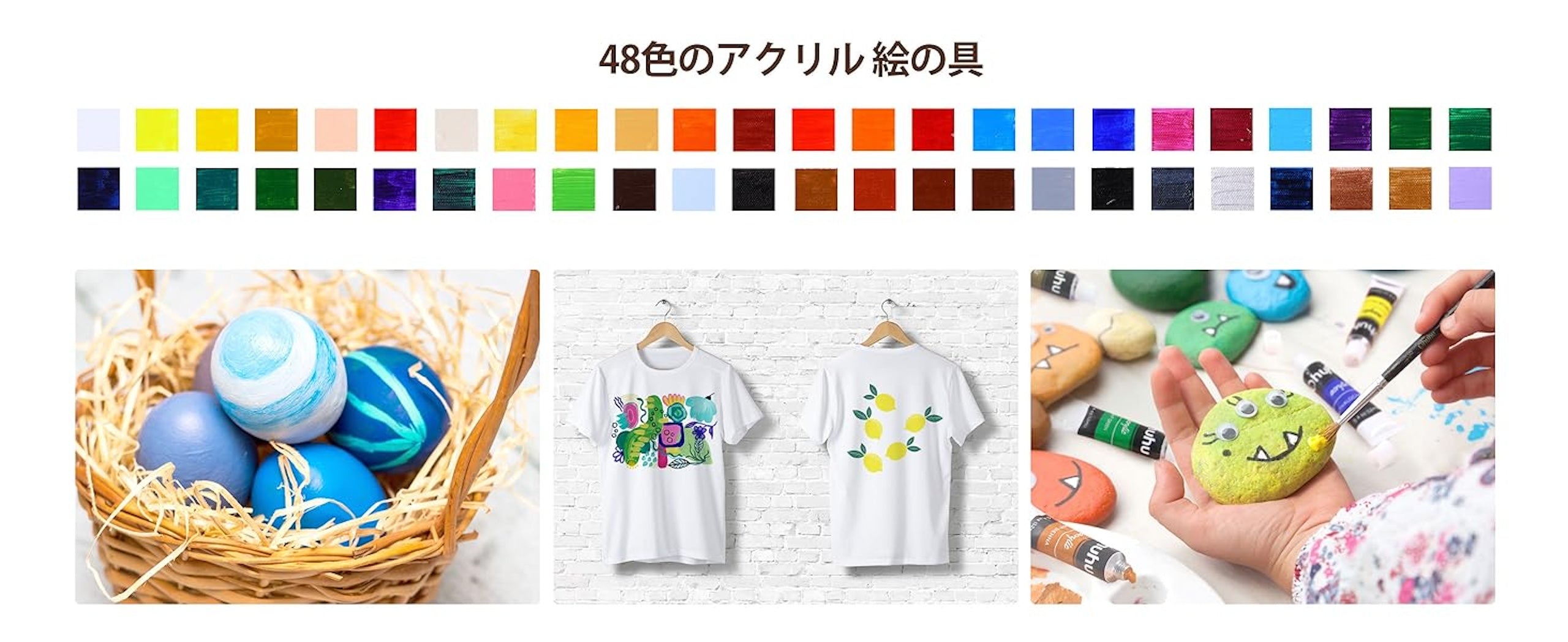厳選された高品質顔料を使用して生産された48色アクリル絵の具セット。色が鮮やか、顔料が均一で滑らか、水に溶けやすい。乾いたら耐水性を発揮し、写生に最適です。伸びがよく、褪色しにくく長期間鮮やかな色を保ちます。Tシャツ、キャンバス、キャンバストートバック、石、壁などザラザラとする表面で絵を描くことに適用です。初心者からプロのアーテイストまで適用です。内容量:12ml。