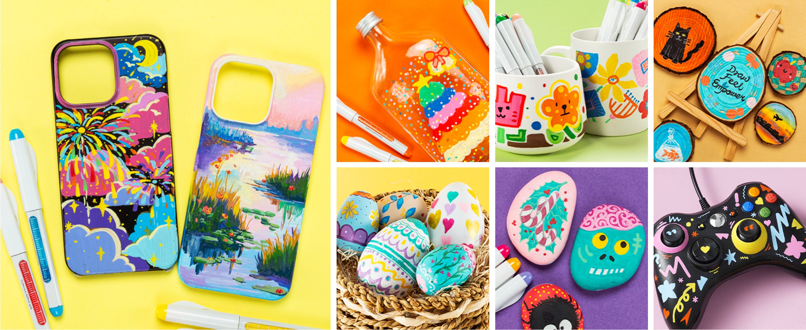 紙、キャンバス、石、木材、ガラス、セラミック、布、金属他。幅広い素材に対応しており、自由なアート表現を楽しむことができます。