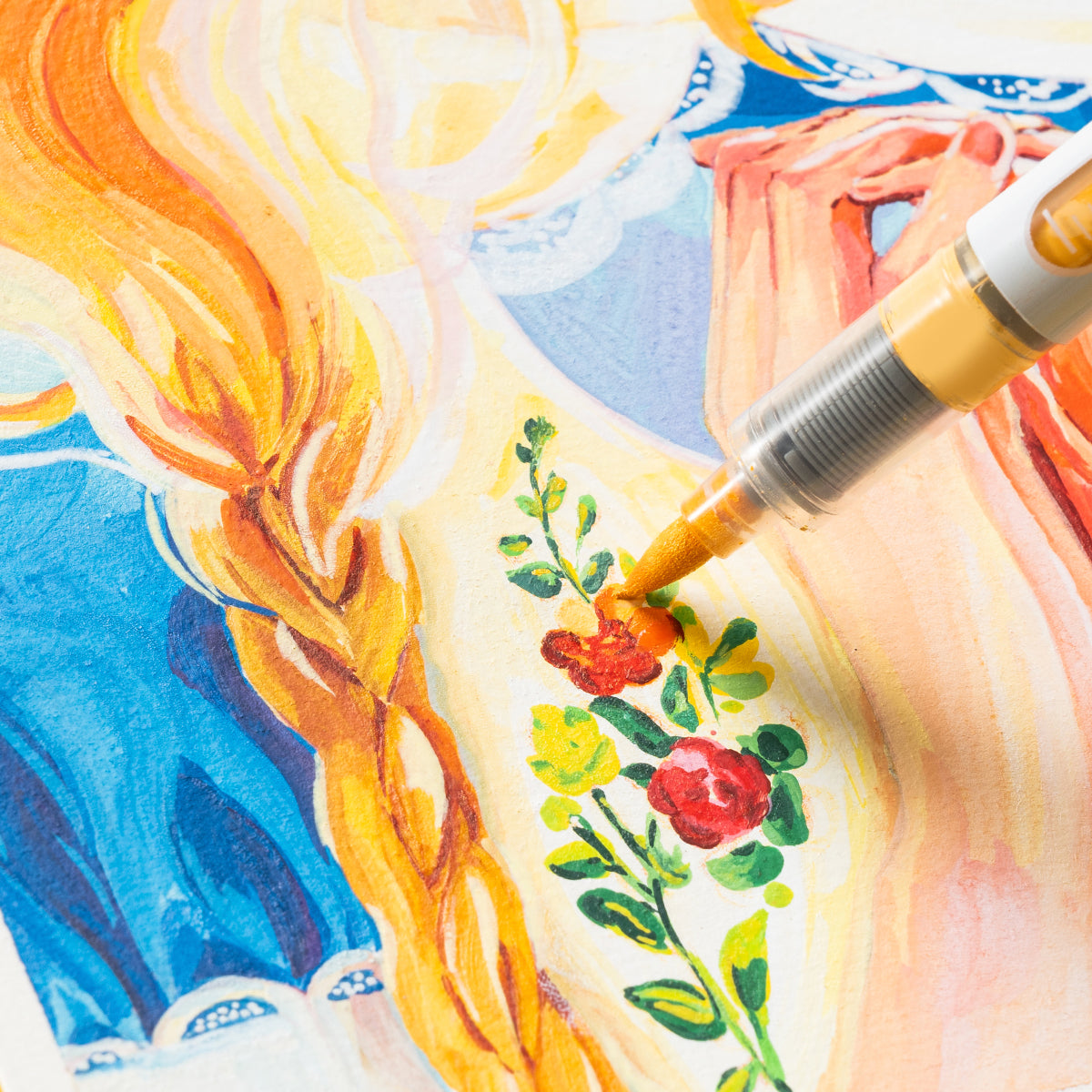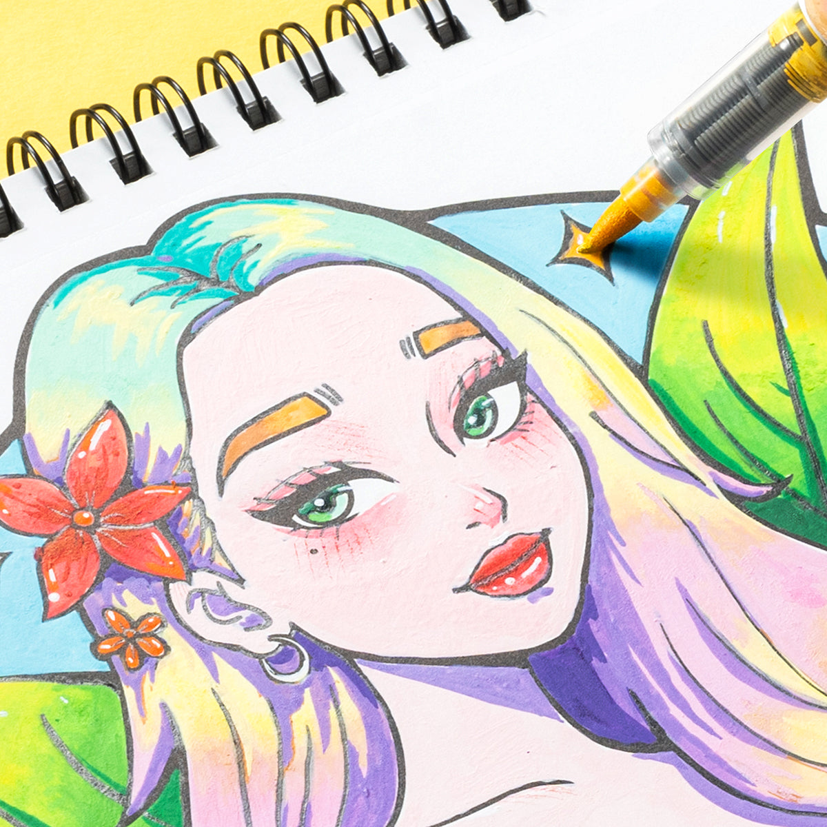 不透明な水性インクで、レイヤー表現・重ね塗りにも最適です。乾燥させることで耐水性が向上し、色褪せや退色がしにくいため、アート作品を長期間保つことができます。