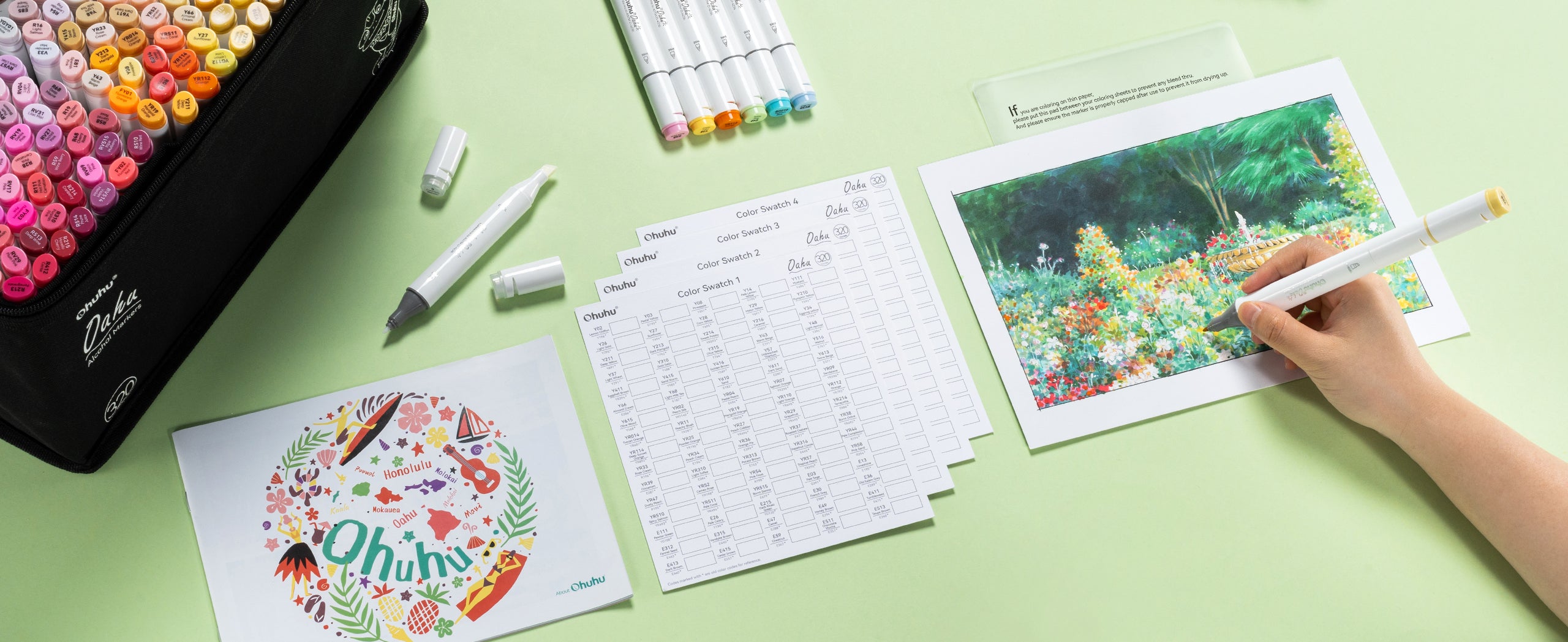 独自開発された高品質のインクは、滲みや色むらが出にくく、初心者でもきれいに着色することができます。なお、Ohuhuインクは他社製品より乾く時間か短く、より早く紙へ染み込みすることができ、こすってインクが付着することはありません。